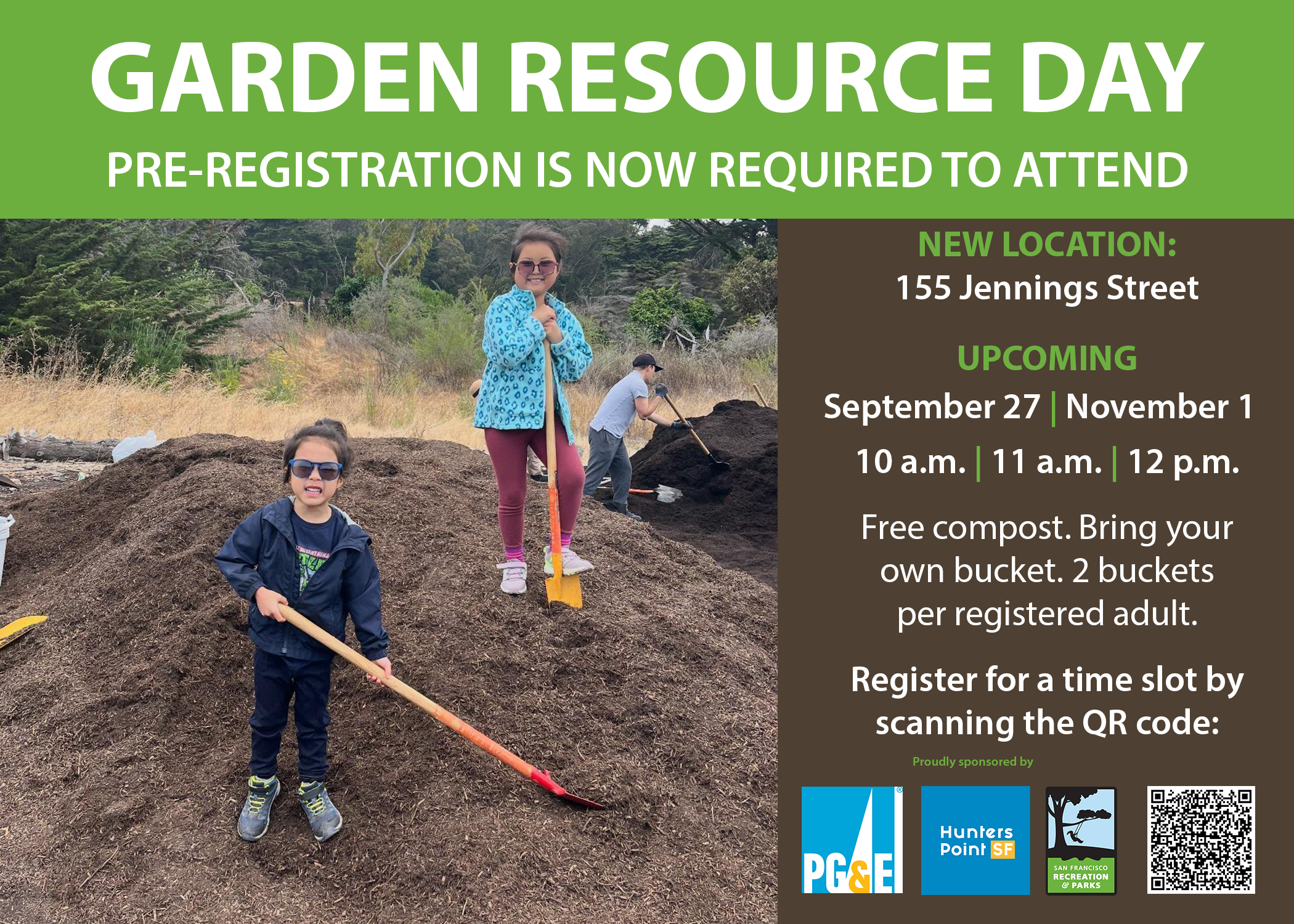 Sponsored by the the San Francisco Recreation and Park Department's Urban Agriculture Program, Garden Resource Day provides free materials for the backyard gardener, community gardener, or urban farmer: compost, seeds, plant starts and composting worms when available. This is a “bring-your-own-bucket” event and amounts are limited.